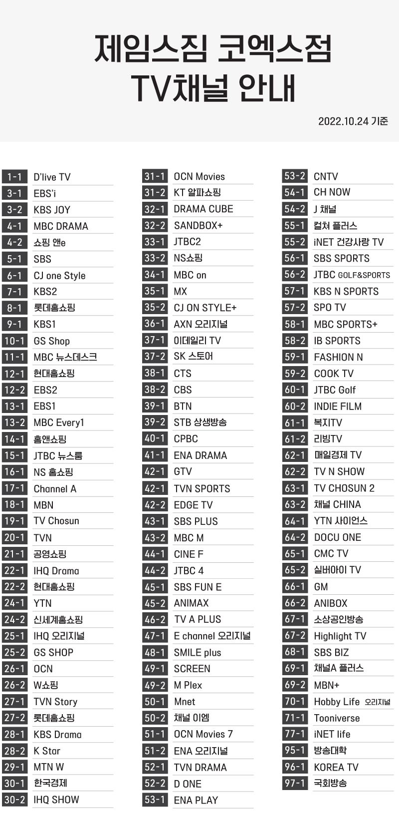 코엑스점 TV채널 안내